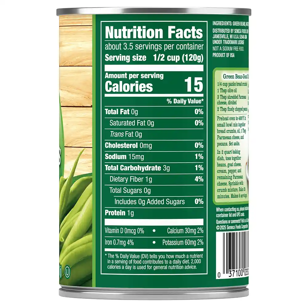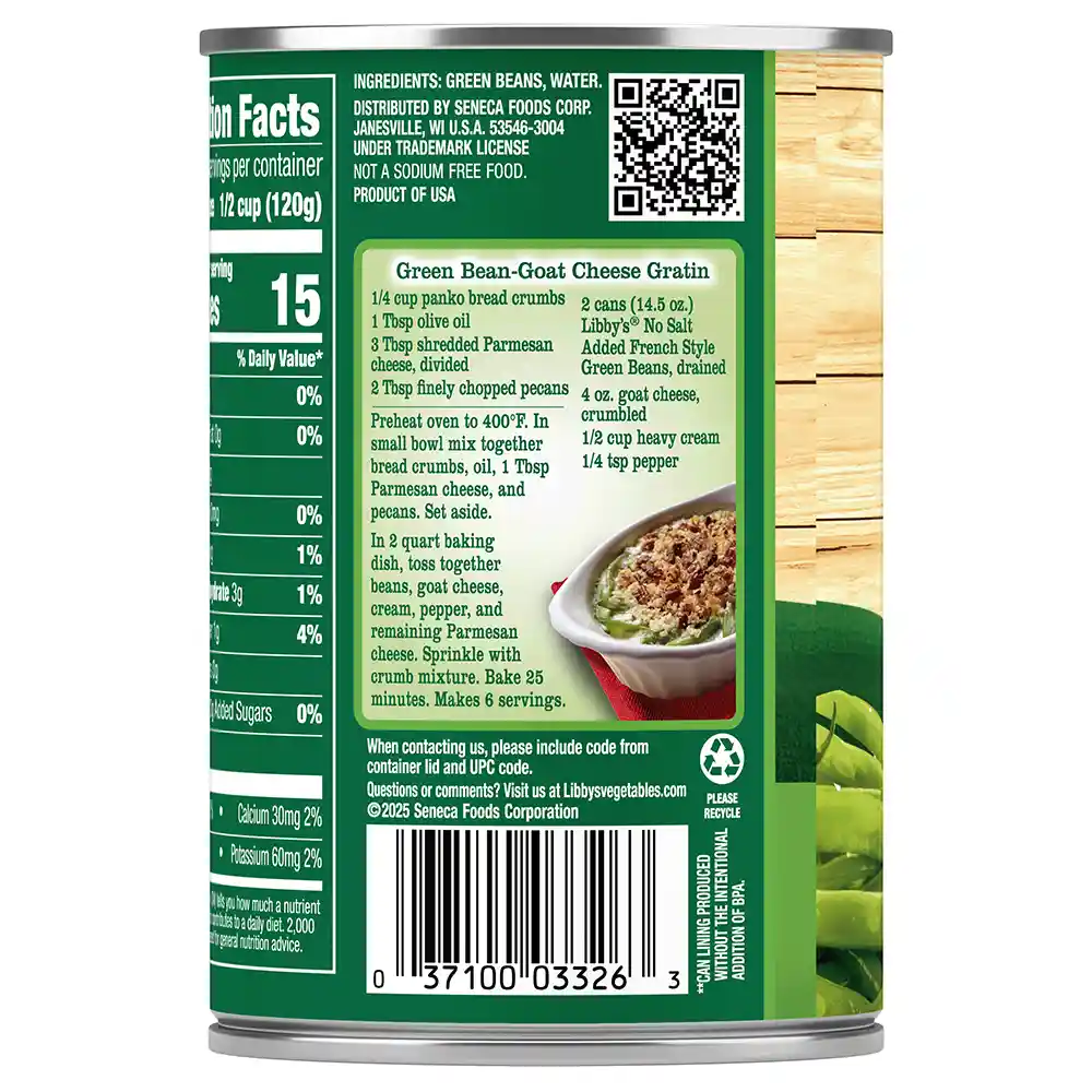 Libby’s No Salt Added French Style Green Beans are made with green beans harvested fresh from USA family-owned farms, sliced lengthwise, then packed with only water. Our canned French style green beans provide a classic look to your recipes with no preservatives, added salt, or sugar. Libby’s No Salt Added French Style Green Beans are a wholesome choice for sides and adding freshness to your favorite dishes.