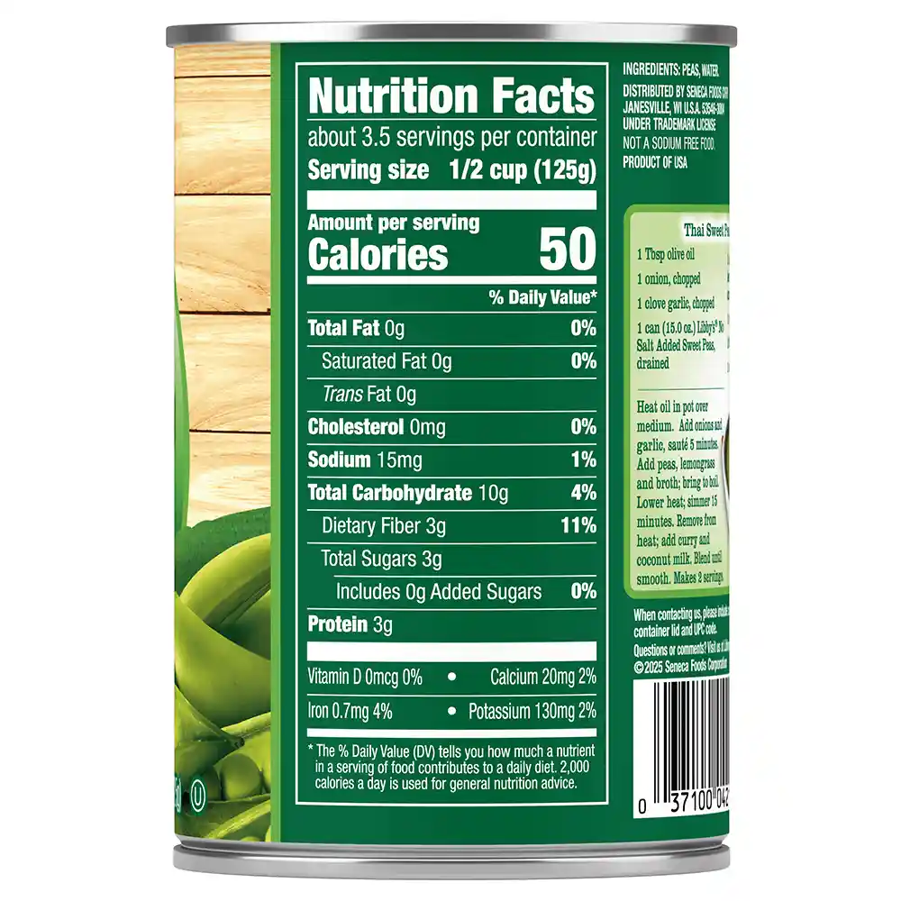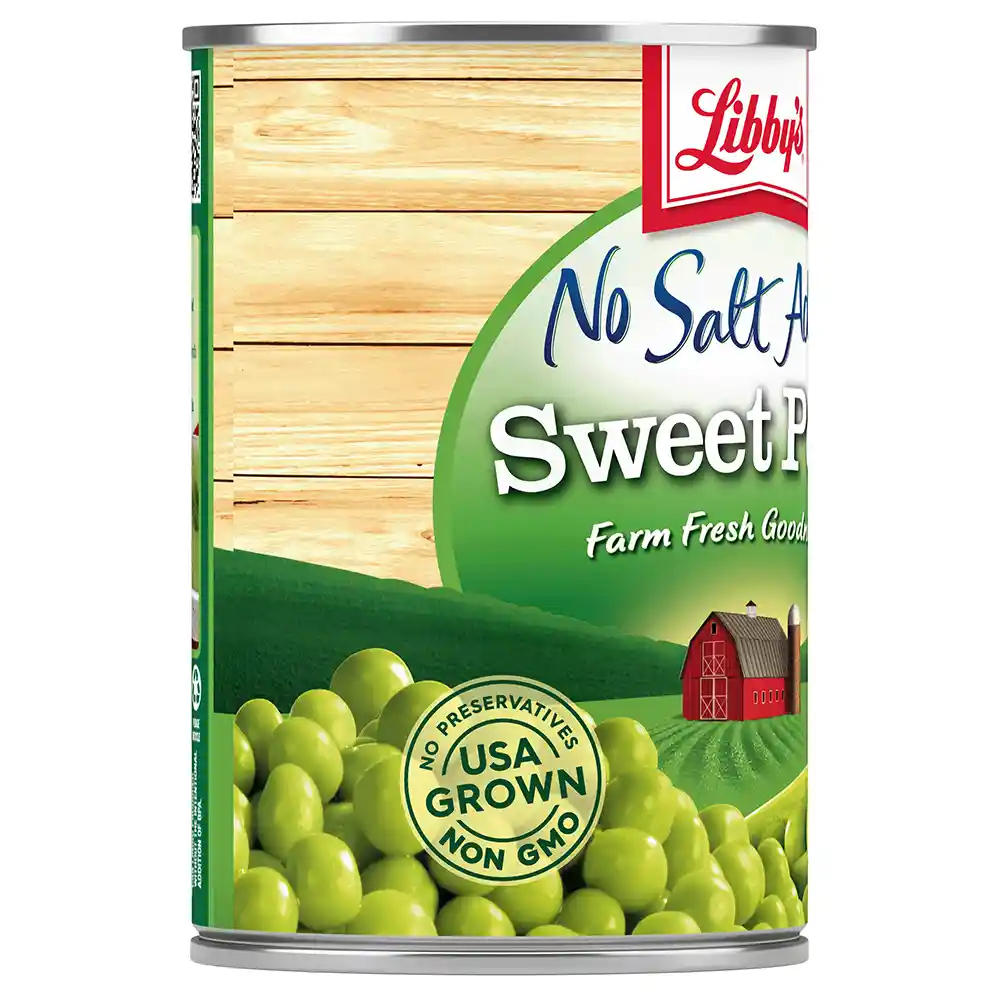 Libby’s No Salt Added Sweet Peas are made with freshly harvested peas grown on USA family-owned farms then packed within hours to lock in their fresh flavor and tender texture. These canned peas contain just peas and water—no added salt, sugar, or preservatives—for pure, naturally sweet taste and smooth, creamy goodness. Libby’s No Salt Added Sweet Peas are a wholesome, zero fat food that’s perfect as a side dish or fresh addition to your favorite recipes.